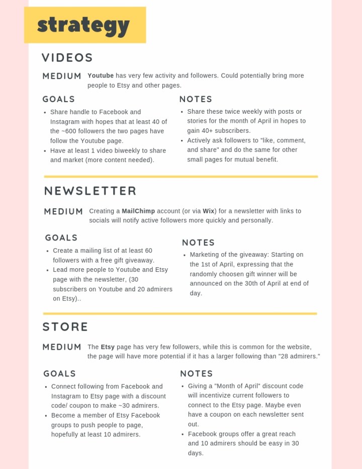 Below is my example “Social Media Strategy” with three different types of content and media. It is important to note that each ‘goal’ is set to a time table, for this example it was the month of April, but have a timed end goal will help give motivation to meeting the goal.