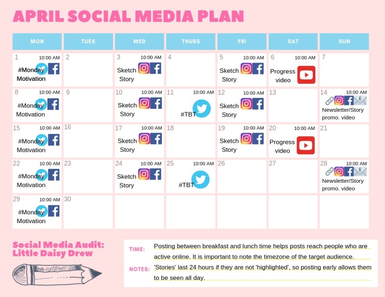 A ‘Social Media Audit’ is a multi-leveled way to improve one’s social media presence. For my project, I chose illustrator Daisy Drew, went through her website, Instagram, Facebook, Twitter, what have you, and came up with an example strategy, plan, and posts.
