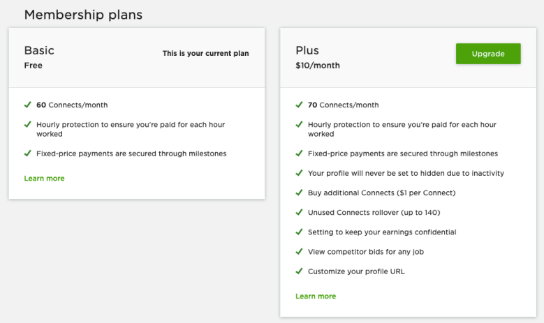 Upwork is free to use but also, like everything, has a premium version that is $10 monthly. The “Plus” has no change in the percent that they take from your profit but there are also a few bonuses worth mentioning.
