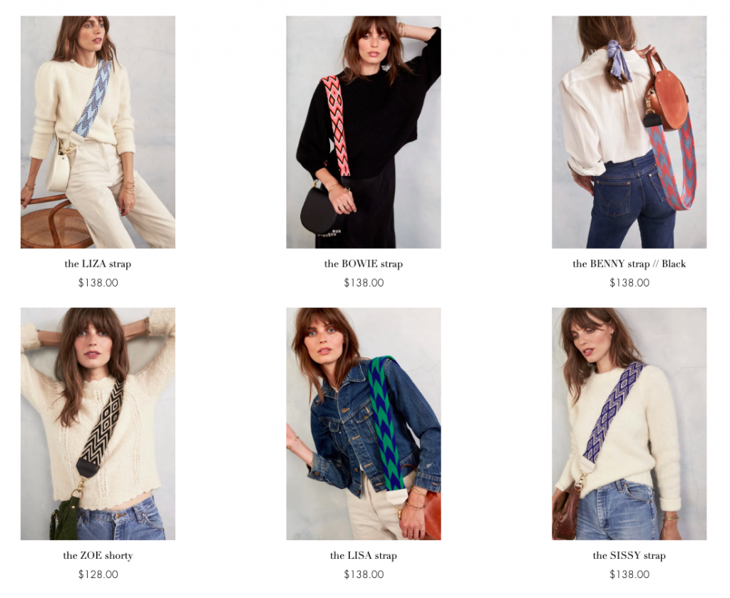 Salt’s sole product in “the shoppe” is attachable hand-woven cross-body handbag straps, which are also gorgeously patterned in both chic color pallets and monochromatic designs. The detachable quality of the Salt straps even inspired the prominent brand Lululemon to create the very same product, in its “festival shoulder strap” for a much smaller $38.