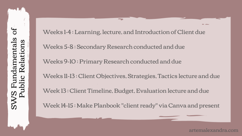 Overall, throughout this planbook project, the way in which the course was taught was quite confusing to me – but following the end of the class, I would not have organized it in the same manner. There is no “right way” to go about things and there will never be as business public relations and marketing changes every day.