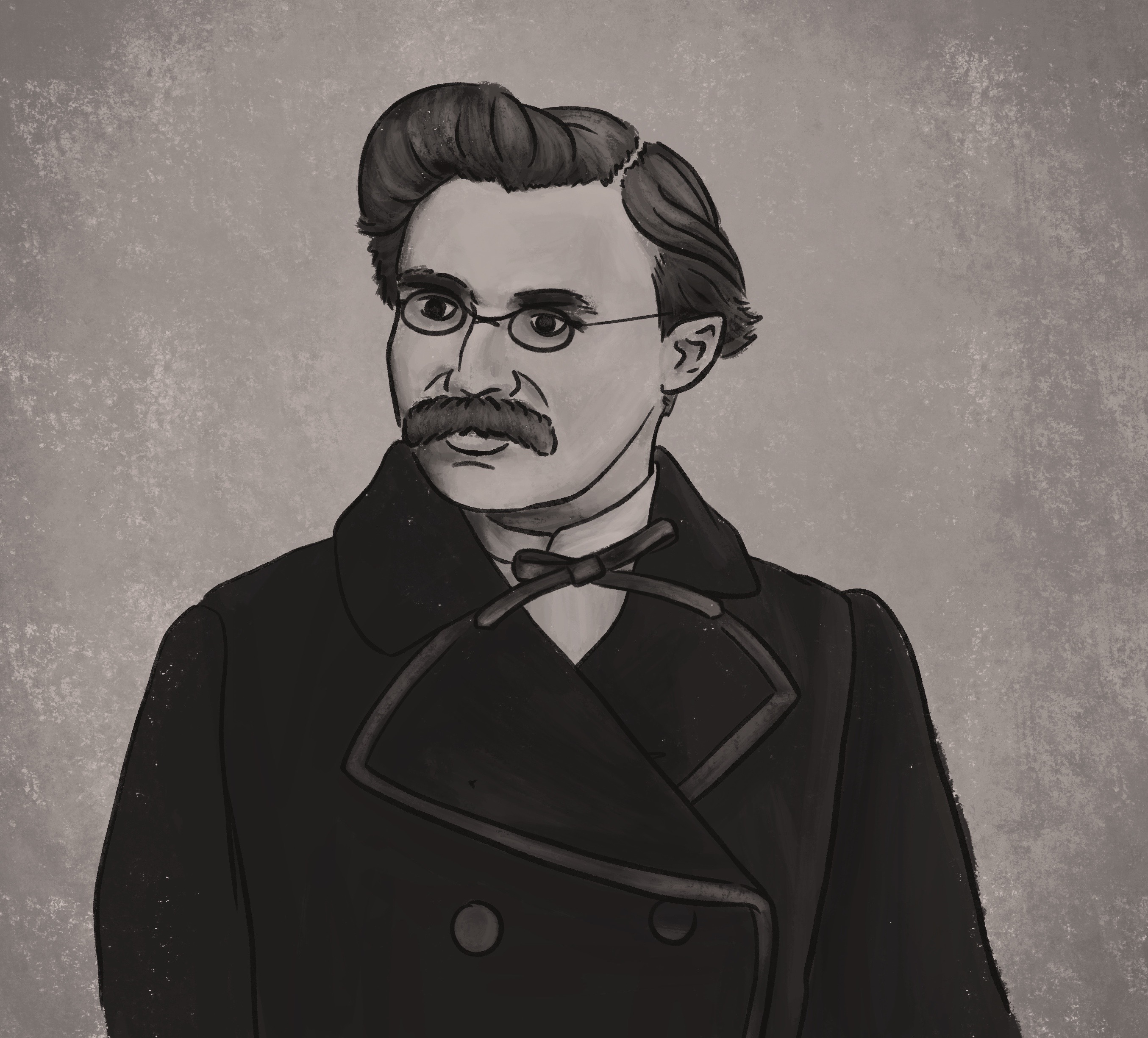 More ideas that I practiced at home included things like fun poses and hands with a whole collection of what I like to call “purple ladies.” One thing that I especially had to practice was drawing men, grown men, I always had a habit of just drawing ladies; I ended up creating two paintings of the philosopher Friedrich Nietzsche and found the men are not too difficult to draw. Another piece that I started was a painting of a desk room with my desk and bedroom window – perspective has to be the hardest type of art to master but definitely necessary.