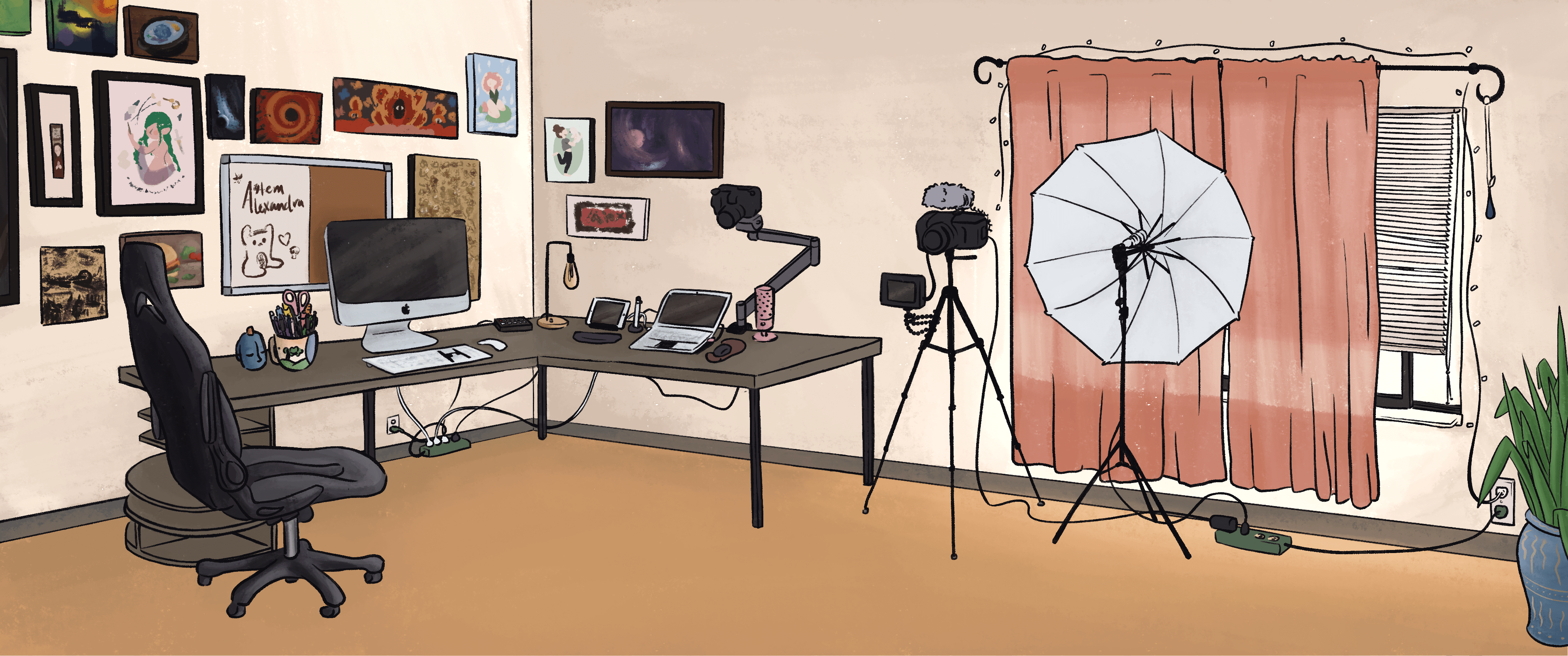 Coloring and shading something so large, with so many details, was an endeavor in and of itself. Using procreate, I was able to duplicate the canvases and keep the line-art as its own file. According to its statistics page, the line-art only took 19 hours, whereas the entire piece fully finished was 41 hours. Meaning that the coloring and shading took slightly over half the time, but of course, that is the only way to make the lines come alive. Overall, another three months passed before I was completely done! One thing that I did to add more detail was to “Facebook stalk” Todd’s photos for knickknacks and fun memories, which added to a lot of the background detail, like the dinosaurs and mugs.