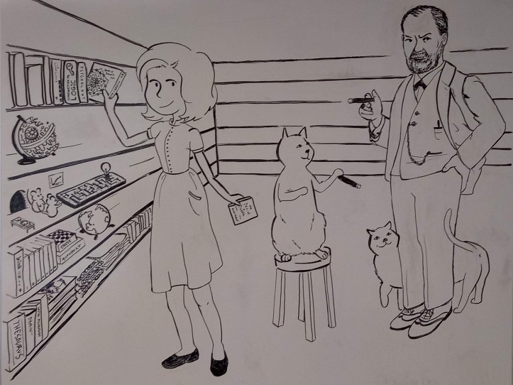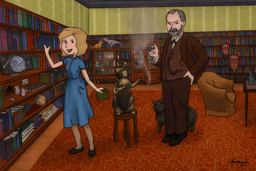 What I had decided was to look for old photos of Sigmund Freud’s actual office/reading room. And to my surprise, they exist! Although, it was filled to the brim with anthropologic antiquities, which was another surprise! The masks in my painting, in addition to the in-shelf shelf and the glass cabinet, were directly inspired by Freud’s office; the masks may be my favorite part of the entire piece, or at least they are in the top three.