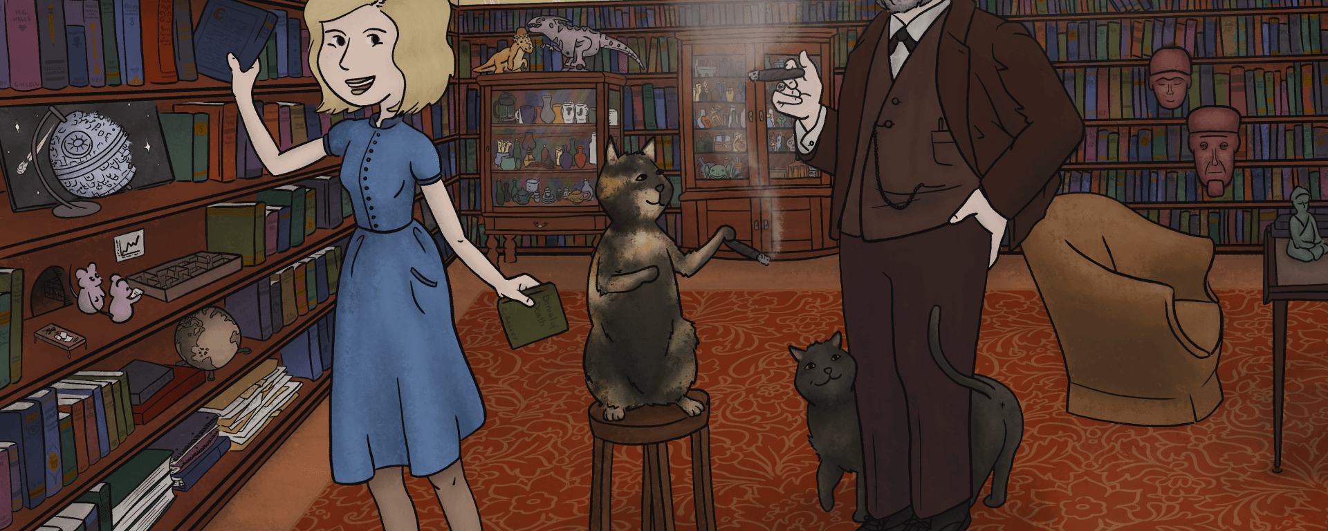 When I was first approached, Todd asked if I could paint his wife, cats, and Freud smoking cigars and reading in a reading room. And immediately, I was elated and the picture started painting itself in my brain. It was not until after winter break when Todd and I met in person to talk about everything. He sent me pictures of everyone and said outside of his ideas, I had total creative freedom!