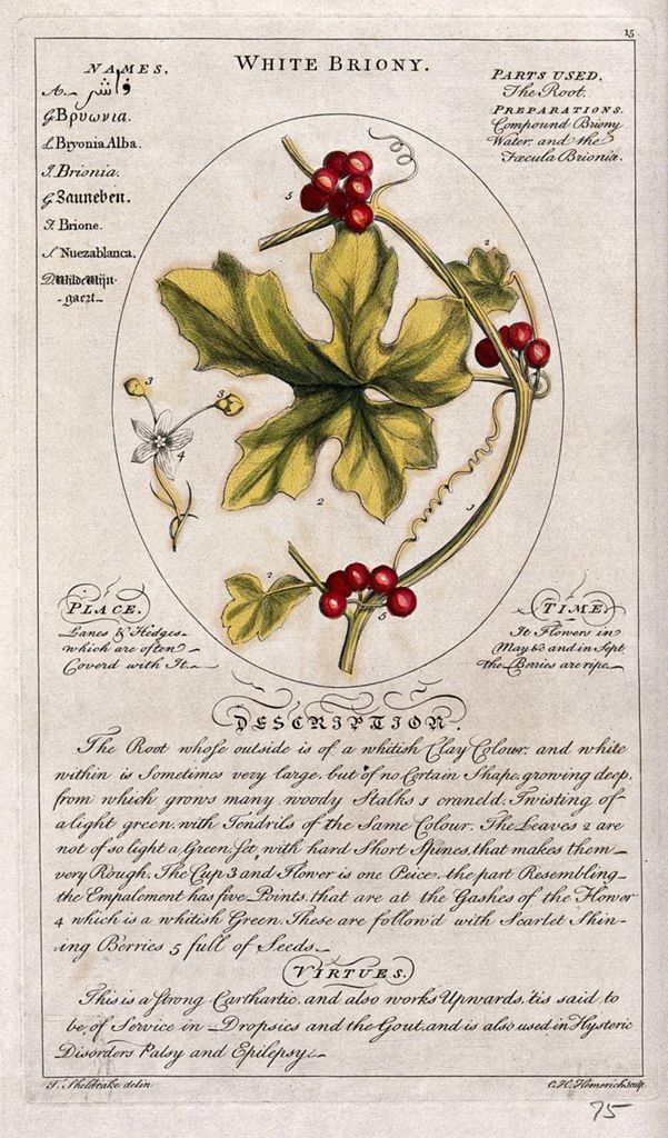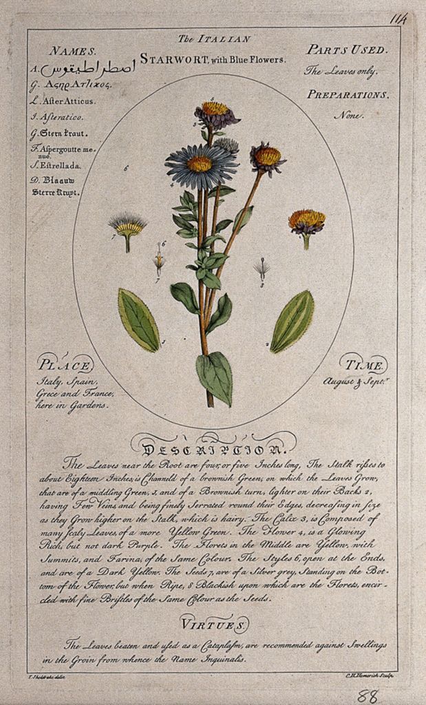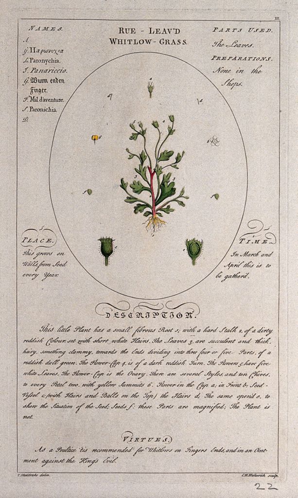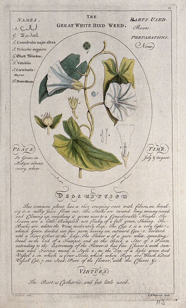 The Botanicum Medicinale lists 118 uniquely identified plants, “describing their places of growth, roots, bark, leaves, buds, time of flowering, blossoms, flowers, stiles, chives, embrio’s, fruits, farina, colours, seeds, kernels, seed-vessels, parts used in medicine, preparations in the shops, medicinal virtues, names in nine languages” and in this, also includes the “most beautifully engraved on 118 large folio copper-plates from the exquisite drawings of the late ingenious T. Sheldrake”. [8]